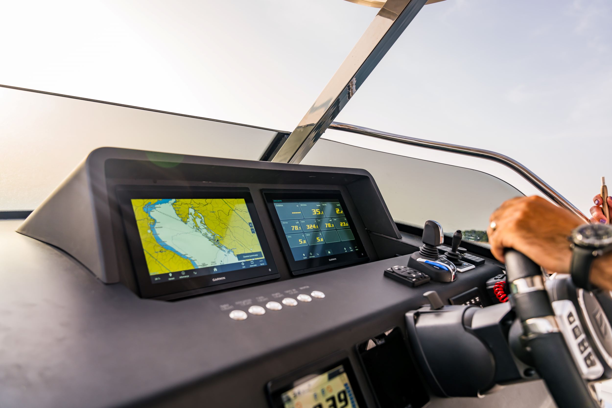 Nagnjeno plovilo v obratu obdrži svoj položaj in za izvedbo manevra ne potrebuje veliko pomoči kapitana. Krmarjenje dvanajstmetrskega čolna pri visokih hitrostih ali v majhnih prostorih na privezih in v marinah zahteva določeno stopnjo spretnosti, vendar je sistem upravljanja obeh izvenkrmnih motorjev in premčnega propelerja z Yamahinim joystickom tako preprost, da ga obvlada tudi povprečen skiper.